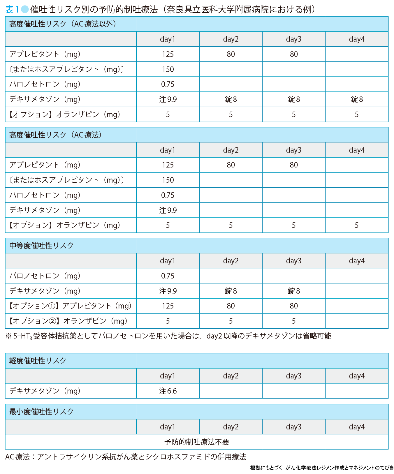 予防的制吐薬は適正使用ガイドラインに基づいて催吐性リスク別に設定します(表1).設定は最新のガイドラインに準ずることが望ましいです.ただし,海外と日本では用いられている制吐薬や添付文書での投与量が異なる場合もあり留意する必要があります.