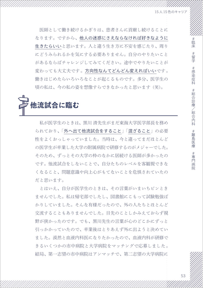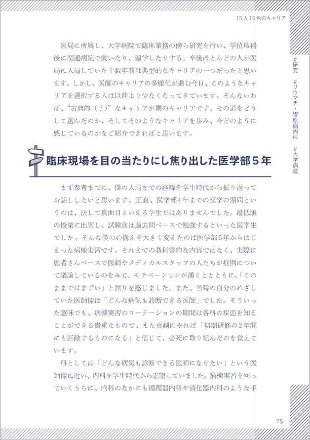 15人の一見?バラバラなキャリアを辿っておられる先生方のお話が書かれていて、これからキャリアを考えていこうという医学生さんや研修医の先生が読まれると大いに参考になるだろうなと思います…。