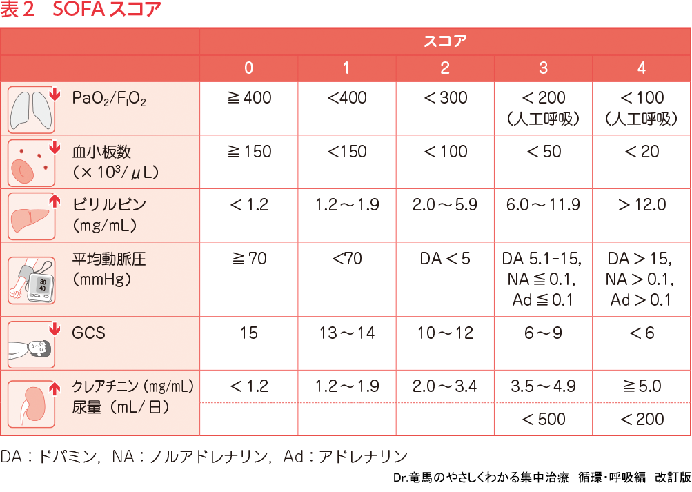臓器障害を見るのにSOFAスコアという6臓器からなる(比較的)簡便なスコアリングを使うようになったのも今回からです.元の状態と比べて2点以上上昇していればSOFAスコア陽性ということで,これまでに比べるとシンプルになった感があります.
