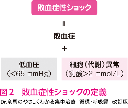 - 敗血症性ショック = 敗血症 +輸液に反応しない低血圧 + 乳酸高値