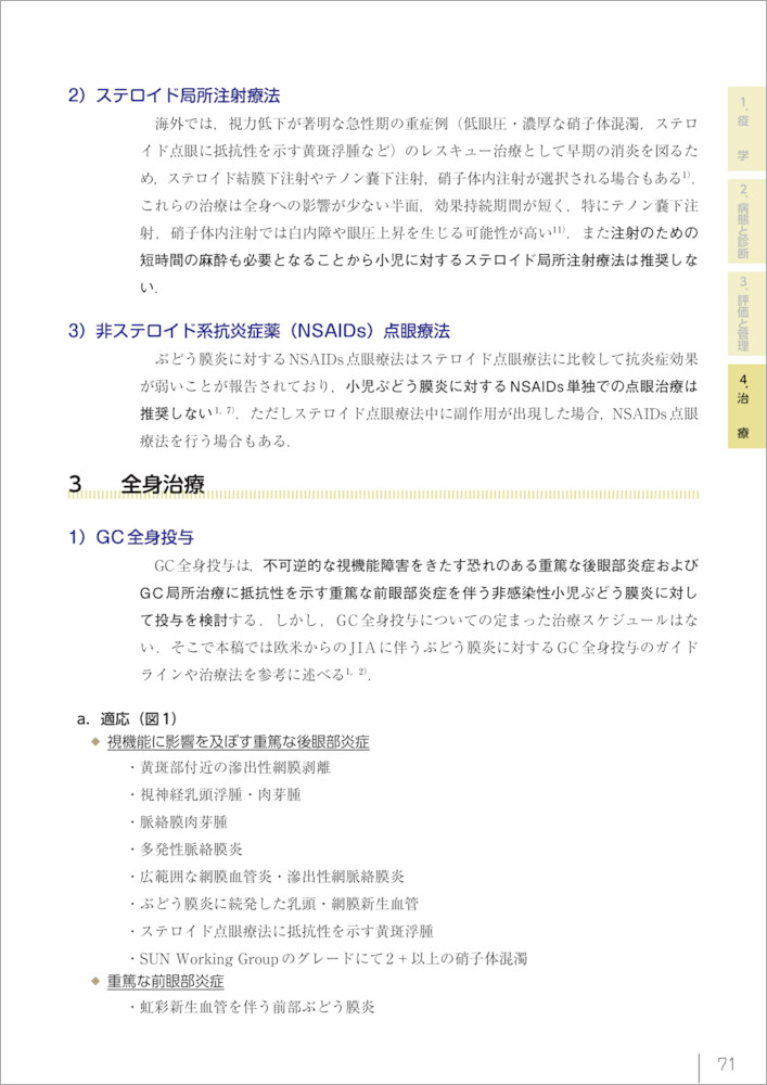 TINU症候群におけるぶどう膜炎では前眼部炎症を呈する症例が多くステロイド点眼療法と散瞳薬による局所治療が主体となる1).一般的に視力予後は良好であるが後眼部病変により視力が低下する症例もみられる.点眼治療を開始後,いったんは治療に反応するものの,点眼回数の減量により再燃をきたす症例が多い1).眼底病変の増悪,急速な腎機能の低下,ぶどう膜炎や腎炎が再燃,遷延化をきたした症例ではGCの全身投与が必要となる1,2).またぶどう膜炎と腎炎の活動性は必ずしも一致しない2).本稿ではTINU症候群のぶどう膜炎に対する局所,全身治療について述べる(図1).…