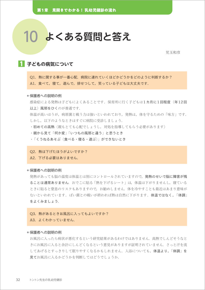 そんな彼らに本書は福音となるでしょう.原先生,児玉先生,中村先生編集の本書には,第1章で時期別のエッセンスが「見開き一枚」で書かれています.私が乳幼児健診に行くときはその時期の健診の該当部分をコピーして持って行きます.第2,3章は重要な症候学が知る人ぞ知るエキスパートによって記述されています.私は気になった症候があれば,捜し物をする振りをして,バックヤードに入ってこそこそとその部分を読むでしょう.そして第4章のコミュニケーションの実践法,これは小児科入局後最初のオリエンテーションで声に出して読ませたい文章です.これは乳幼児健診参考書という枠を超えた智慧の章です.