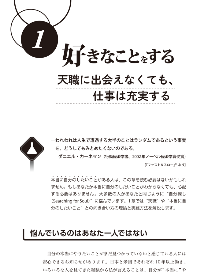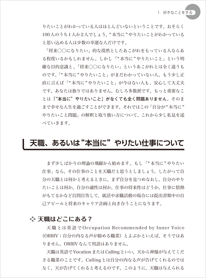 - 人生の大半の時間を過ごすことになる仕事を充実させるために知っておくべき「天職の真実」について解説し、「天職」の取り扱い方と「天職」を巡る自分探しの旅を止める方法を教えます。