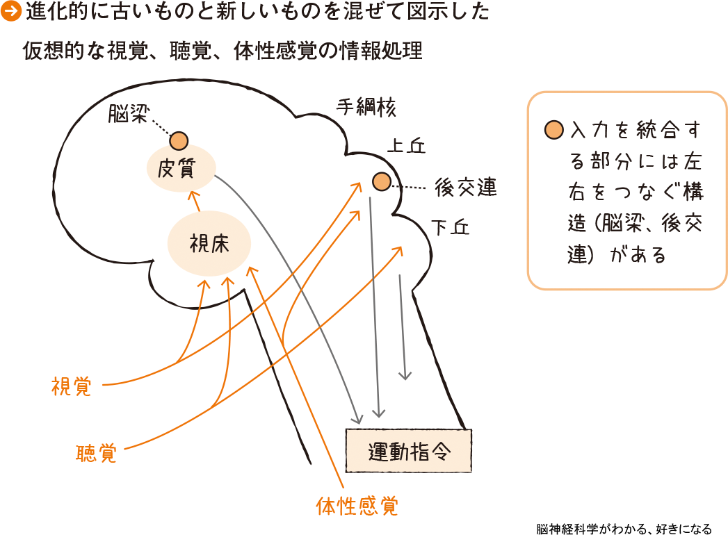 つまり、感覚の処理にかかわる部位は、例えば視覚の場合は上丘と大脳の視覚野などのように、新旧のモジュールがレイヤーを形成していて階層性があるということです。私たちは進化の過程で今まで存在していたものの上に新しいものを足していくので、逆に言うと古い系を無視できない形になっています。