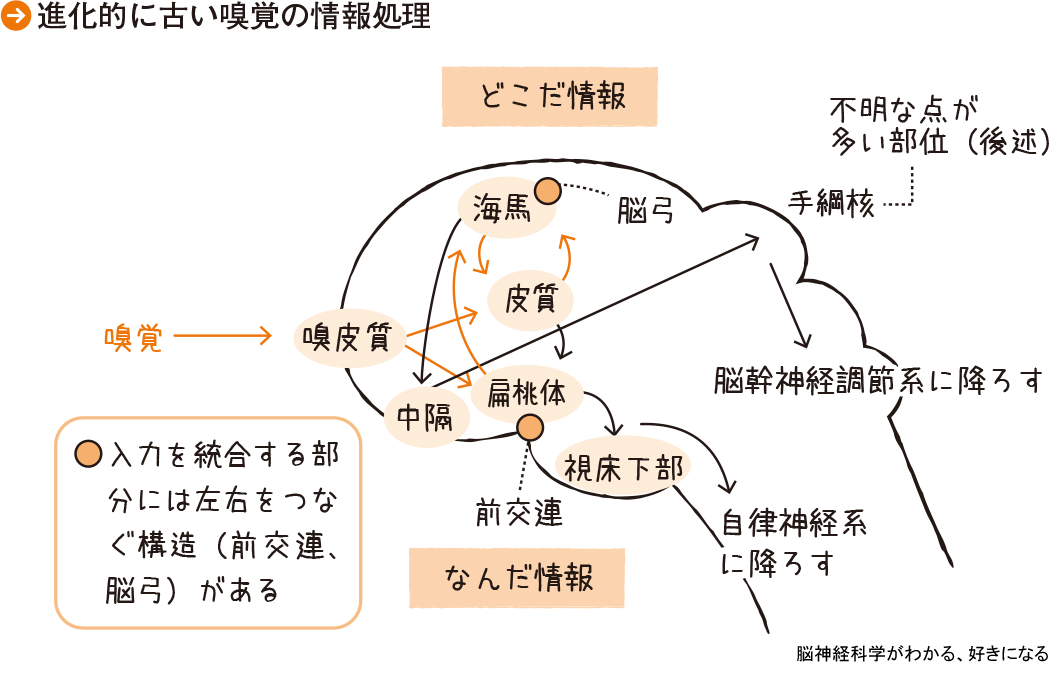 - ① 嗅覚の情報は「なんだ情報」が扁桃体で処理され、自律神経系や手綱をへた調節系につながり、情動を司ります(腹側経路)。