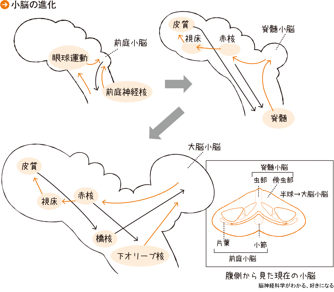 小脳には運動に関係する情報が入り運動調節の情報を返します。進化的に3段階に分けて発達したと考えます。