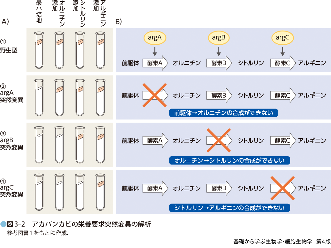 これらの結果は,アルギニンがアカパンカビの中で生合成される経路(前駆物質→オルニチン→シトルリン→アルギニン)があって,その各ステップを触媒する酵素が,argA,argB,argCという遺伝子によってコードされていると考えるとうまく説明ができる(図3-2B).