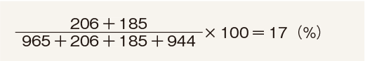この現象は,2つの遺伝子が同じ染色体上にあり,配偶子をつくる過程で染色体の交叉によって遺伝子の組換えが起こったと考えると説明がつく(⇒1章-54).そこで,この値から組換え価を計算した.もしも完全連鎖をしている(組換えが起こらない)なら,BVgとbvgしか生じないはずであるが,Bvgが206,bVgが185個体,生まれているので,この和が組換えの結果生じた新しい組合わせである.したがって,新しい組合わせが生じた組換え価は,分母に検定交雑の全個体をおき,分子に組換えの起こった個体数をおいた次の式