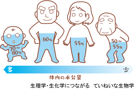 体液の水分は体重の約60%を占め,水は人体を構成する最大の化合物です.脂肪組織に含まれる水分量は少なく,筋組織に含まれる水分量は多いため,人体の水分量は脂肪組織の量に影響されます.成人男性の体内の水分量は体重の約60%ですが,成人女性では成人男性と比較すると脂肪組織の割合が高いため,体重の約55%となります.新生児は細胞外液の割合が多く,体重の70~80%程度です.高齢者では年齢とともに筋組織などが減少する(水分の割合が減る)ため,50~55%程度となります.