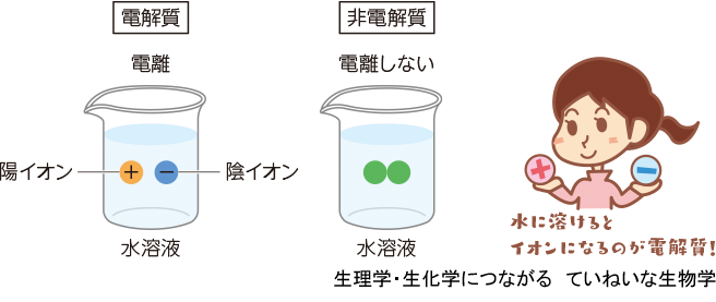 電解質のうち,正(+)の電荷をもつものを陽イオン,負(-)の電荷をもつものを陰イオンとよびます.体液に含まれる陽イオンには,ナトリウムイオン(Na+),カリウムイオン(K+),カルシウムイオン(Ca2+)などがあります.また,陰イオンには,塩化物イオン(Cl-),リン酸水素イオン(HPO42-),重炭酸イオン(HCO3-)などがあります ※3.電解質は,体液の浸透圧やpH ●を調節し,神経細胞や筋細胞が機能するためなどに重要な機能を果たしています.また,体液にはグルコースや尿素などの非電解質も含まれています.
