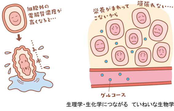細胞外液の濃度を一定の範囲内に保ち,ホメオスタシス ※4を維持することは,細胞が正常に働くうえで非常に重要です.例えば,細胞外液の電解質の濃度が高くなると,細胞内から細胞外へ水が移動しやすくなります(浸透圧の上昇).細胞内から水が出ていくと,細胞の代謝が円滑に進まなくなるうえに,細胞自身も収縮してしまいます.一方,細胞外液である血漿中のグルコースの濃度が低くなると,組織の細胞に栄養素として供給されるグルコースが不足します.このように,細胞外液の濃度が一定の範囲内に調節されなければ,細胞は正常に活動できなくなります.