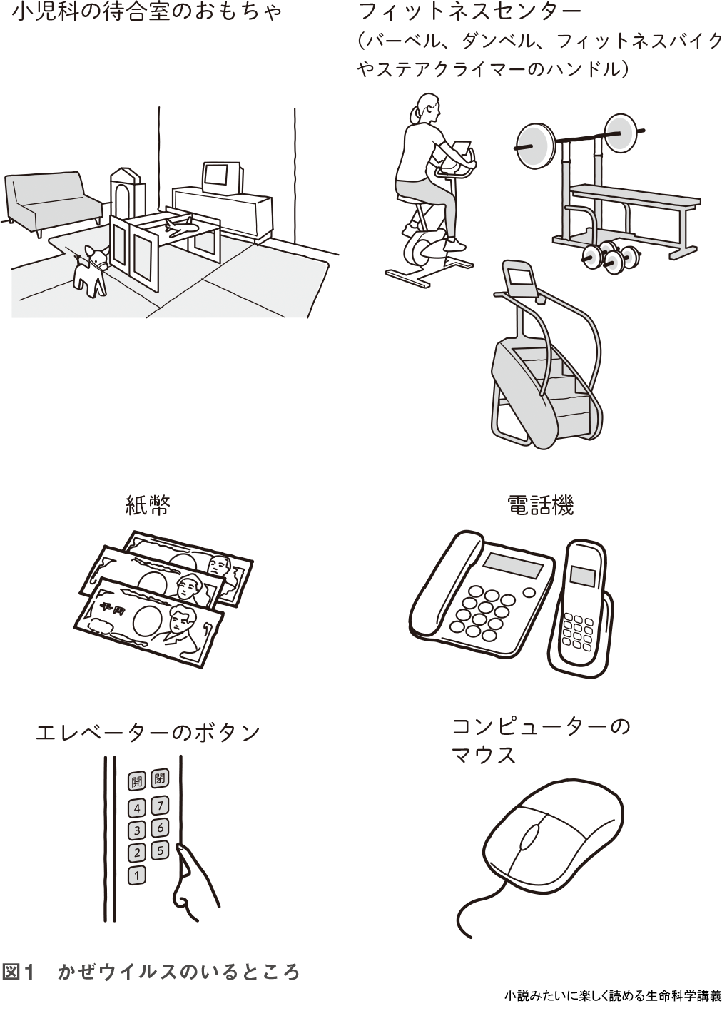 はい、答えです(図1)。一般のかぜウイルスをライノウイルスというんですけれども、そのウイルスがどこにいるかを調べています。小児科の待合室、特に子どもが使うおもちゃに非常に多いことがわかりました。今、病院が危ないと言われているのは正しいことがわかりますね。次に、フィットネスセンター。これも新型コロナウイルスで話題になりました。フィットネスセンターでは、いろんな機械をいろんな人が使いますが、使った後あまり洗ったりしないわけですね。それで細菌がたくさんつきます。例えば、バーベルやダンベル、フィットネスバイクは、どれも手でつかんで使うわけで、その手でつかむようなところに細菌がたくさんいることがわかっています。次に、エレベーターのボタン。後で出てくる