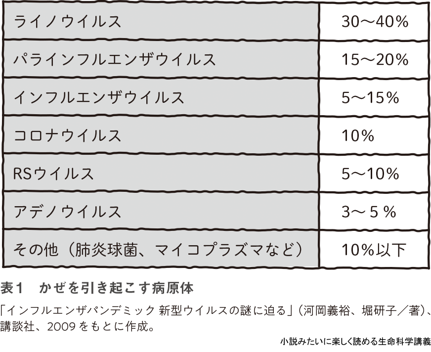 かぜってなかなか治らないですよね。かぜがどんな病原体から起こるか知っていますか? ライノウイルスが全体の三〇〜四〇%くらいを占めています(表1)。インフルエンザウイルスが五〜一五%くらいで、それに非常によく似たパラインフルエンザウイルスっていうのも一五〜二〇%くらいいることがわかっています。その他には、四番目に書いてある今話題のコロナウイルスがあります。コロナウイルスは、インフルエンザと同じようにかぜを引き起こす病原体の一つで、全体の一割を占めることが前々からわかっています。その他にもいろんな病原体があることがわかりますね。