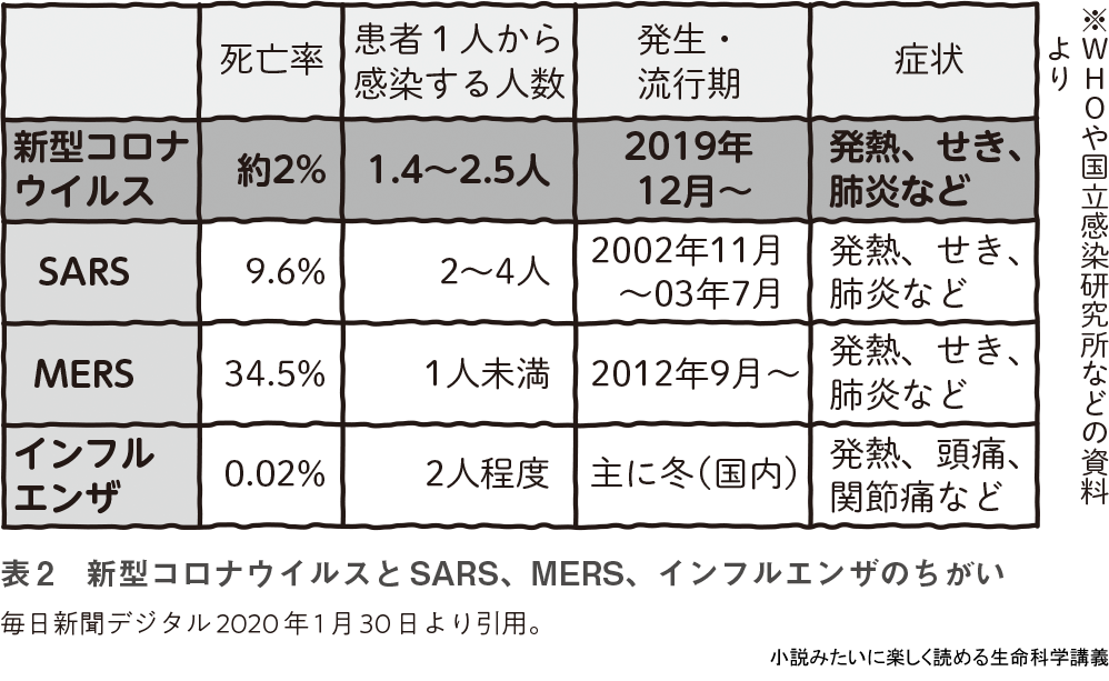 昔はやった同じコロナウイルス感染症のSARSやMERSはもっと死亡率が高くて怖いんですけれども、これと今の新型コロナウイルスがどれくらいちがうかというのは、だいたいのデータが表2に書いてあります。これを見ておわかりのように、普通の季節性インフルエンザだったら死亡率低いですよね。ところが新型コロナウイルスは約二%という死亡率になっています。二〇〇二年にはやったSARSは、一〇%ぐらいの死亡率です。二〇一二年にはやったMERSは怖くて、三四・五%も死亡率があります。これに比べて二%は低いです。だけど、季節性インフルエンザよりも圧倒的に怖いということがわかります。