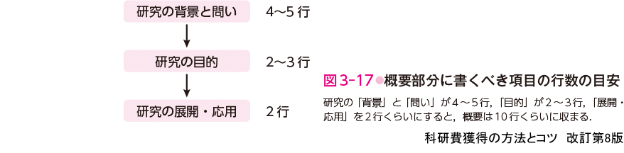 この例では研究の「背景」が大部分を占めて,「目的」が少なくアンバランスなことがわかるだろう.しかも,研究の「展開・応用」にはまったく触れられていない.概要部分は全部で10±1行くらいを目安とすると,「背景」と「問い」に4~5行,「目的」に2~3行,「展開・応用」に2行といったところが適切な分量である(図3-17).
