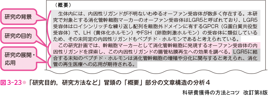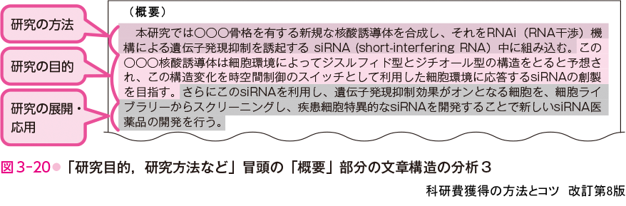 この文章の構造は,研究の「方法」,「目的」,「展開・応用」となっており,肝心の研究の背景が書かれていない(図3-20).しかし,この例のように概要部分に研究の「背景」が抜けていたり,あるいは研究の「展開・応用」が書かれていないものでも,本文を読むと「背景」や「展開・応用」がきちんと書かれている例がほとんどだ.この例のもととなった申請書のなかにもきちんと書かれていた.
