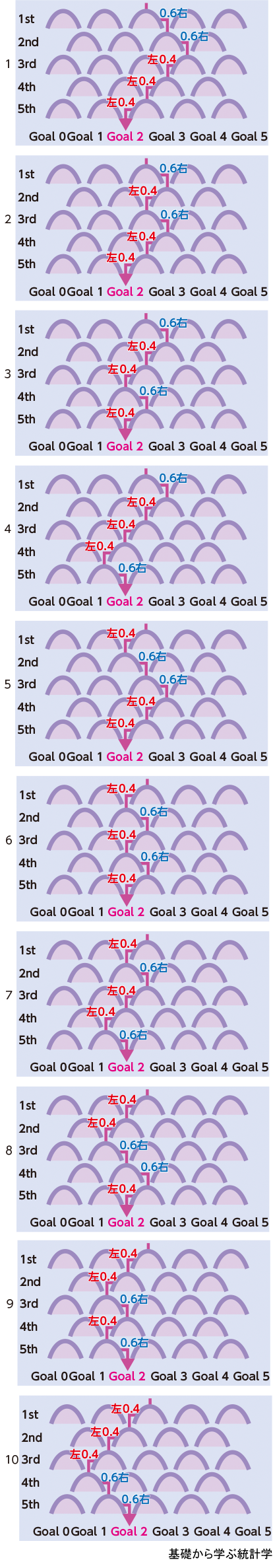 です。そして、全部で10通りの経路があります。そこで、ゴール2に降りてくる確率は、この2つの積