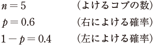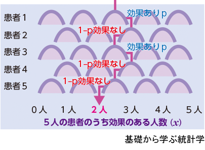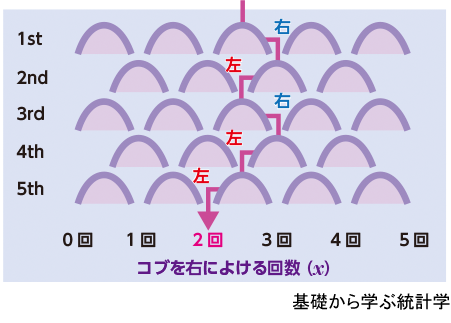コインを投げることを考えます。表が出る確率がpで、裏が出る確率が1−pであったとします。このコインを5回投げたとき、表がx回出る確率P(X=x)は、コブ斜面と同じ計算で得られます。スキーの図を、次のように読み替えます。