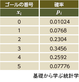 となる。xに0, 1, 2, 3, 4, 5, 6を順番に代入すれば、以下の確率分布が得られる。