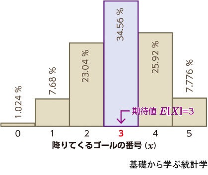 二項分布の場合、期待値E[X]は、確率が最も高い、確率分布の頂点の位置を教えてくれます。