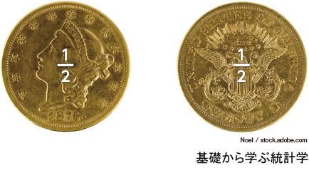 コイン投げを考える。表が出る確率と裏が出る確率は等しく、ともに1/2だと仮定する。