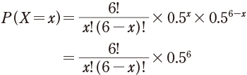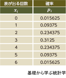 この予想「表が3回」が6回のコイン投げの期待値と一致するかをこの練習問題で確認する。6回のコイン投げに対する二項分布は、二項分布の式