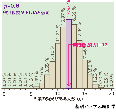 となります。この期待値E[X]=12の意味は「B薬の有効率が0.6であるなら、20人中、その60%の12人に効果があると期待される」です。