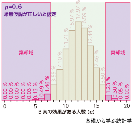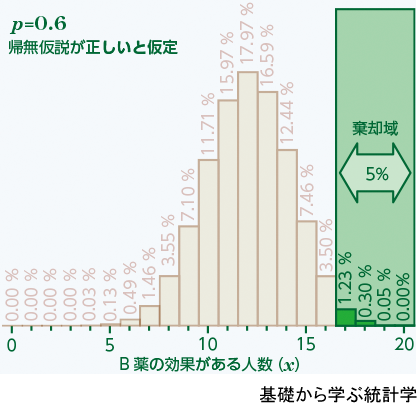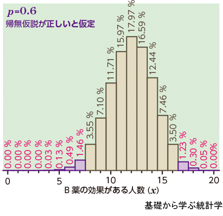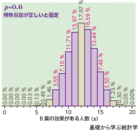 要点をまとめます。患者20人のうち、B薬で効果がある人数は、もし帰無仮説H0「比べるもの同士が等しい」が正しいなら、この帰無分布に従います。