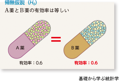 帰無仮説は記号でH0と書きます。帰無仮説H0は簡単です。基本は「比べるもの同士が等しい」です。例題1なら「A薬とB薬の有効率は、等しく0.6である」という仮説を立てます。