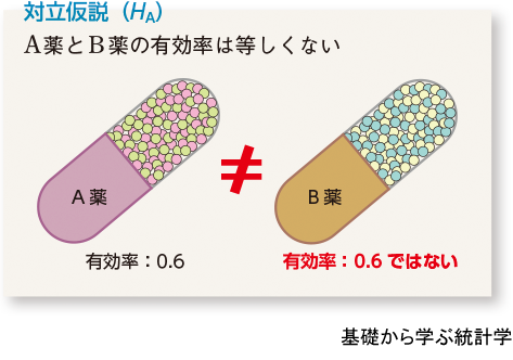 対立仮説は記号にHAやH1を使います。対立仮説HAも簡単です。対立仮説HAは、帰無仮説H0と正反対の内容(もしくは否定の内容)です。「比べるものが等しくない」という仮説を立てます。例題1なら「B薬の有効率は0.6ではない」です。