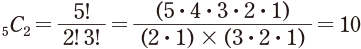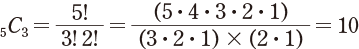 となります。この計算は10通りという答えを教えてくれます。たしかに、試行錯誤して得た、図と同じ答えになっています。