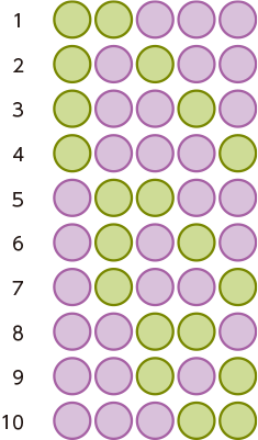 ここで、2つの緑玉と3つの紫玉を、一列に並べてみます。このとき「何通りの並べ方があるだろうか?」という問題を考えます。