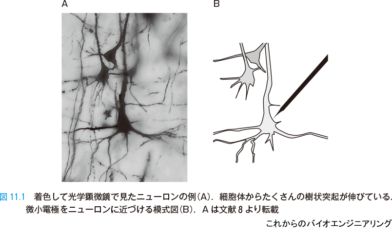 脳を構成する主役の素子は,ニューロン(神経細胞)である.図11.1 A は,ニューロンを着色して光学顕微鏡で見たものである.細胞体の大きさは数 μm~数百 μm(マイクロメートル = 10−6 m)である.コンピュータのトランジスタの大きさが10 nm(ナノメートル = 10−9 m)程度なのに比べて千~十万倍と大変大きい.細胞体からは入力信号を集める