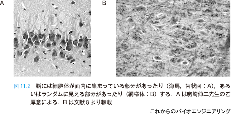 ニューロンは軸索を伸ばしてネットワークを作り,他のニューロンの入力部である樹状突起や細胞体に出力信号を届けている.図11.2 は,たくさんのニューロンがどのように配列しているかを示す例である.図11.2 A ではニューロンは面内に細胞体が集まっていて,層構造をもっている.この層から上下に樹状突起や軸索が伸びている.面内に伸びるものもある.一方,図11.2 B のようにランダムな部分もある.