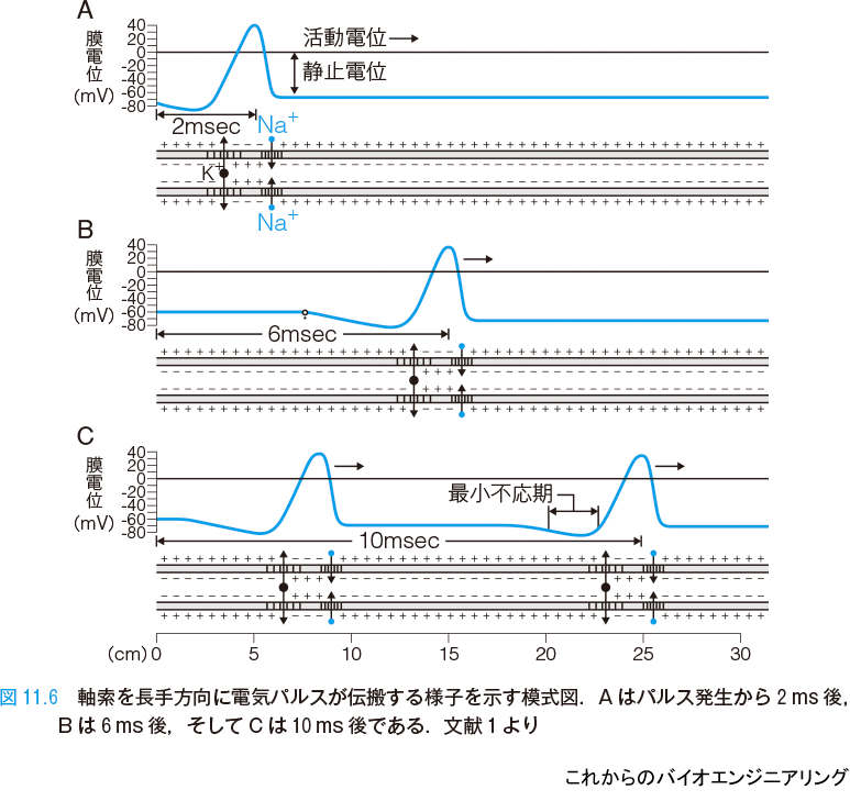 細胞体で発生したパルスが軸索を伝搬する様子を示す模式図を示す(図11.6)[1].チャネルの非線形性によって,パルスはその形を崩すことなく安定して伝搬する.A はパルス発生から 2 ms 後,B は 6 ms 後,そしてC は 10 ms 後の様子である.パルスの伝搬速度はおよそ 1 m/s 程度であるが,速い場合には数十 m/s になる.それは軸索の太さなどによって決まり,太いほど速くなる.