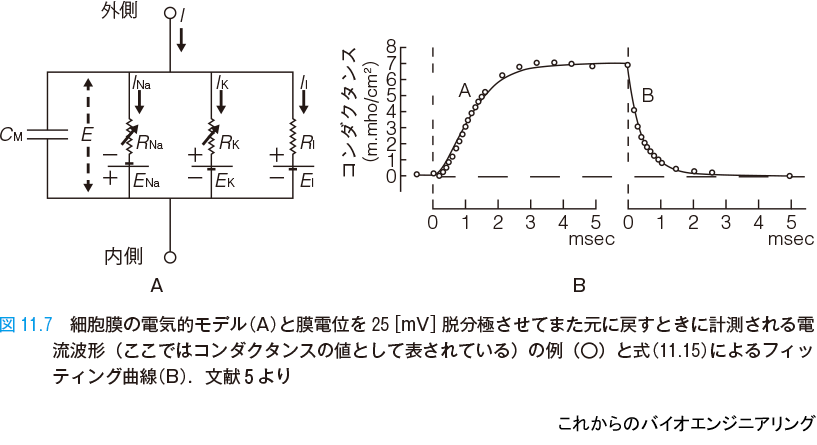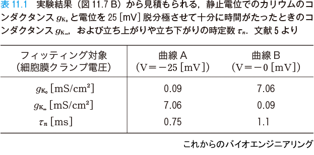 領域A は膜電位固定法でステップ関数的に 25[mV] だけ脱分極させたときの電流の立ち上がり波形であり,領域B は電位を元に戻して再分極させたときの立ち下がり波形である.図中○印が実測点である.ここから静止電位でのカリウムのコンダクタンス gK0 と電位を 25[mV] 脱分極させて十分に時間がたったときのコンダクタンス gK∞ ,および立ち上がりや立ち下がりの時定数 τn が見積もられた(表11.1).