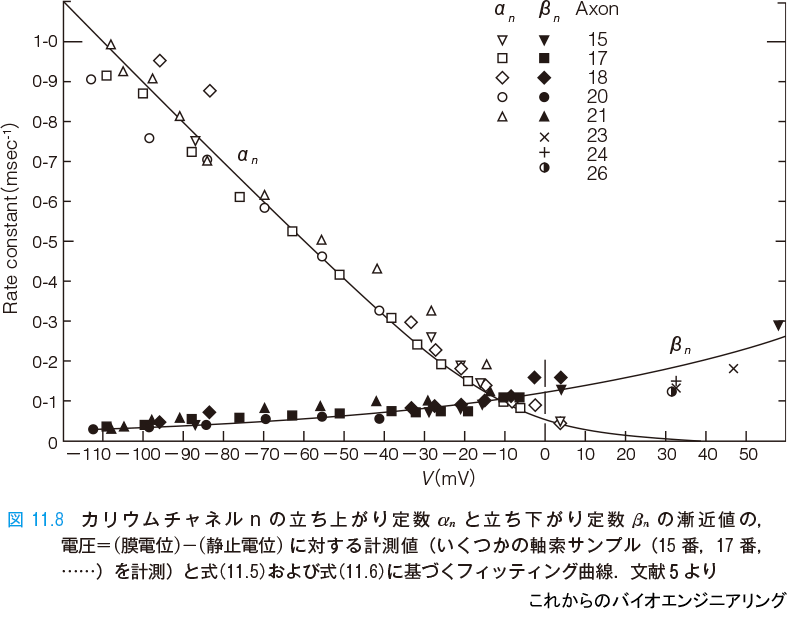 実験値は表11.1 であったことから,さまざまなクランプ電圧 V に対して電圧の関数として αn∞(V)と βn∞(V)(図中では αn とβn と表記)を得ることができる(図11.8).そして,式(11.5)と式(11.6)の具体的な定数を決めることができる*5.