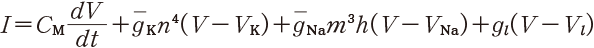 1940 年代後半,ケンブリッジ大学のホジキン(Alan Lloyd Hodgkin)とハクスレー(Andrew Fielding Huxley)は微小電極の直列抵抗を大幅に減らすなどの工夫を凝らし,膜間の電位を強制的に所望の電位に固定する膜電位固定法と名付ける計測方法を開発した.そして膜電位に対する膜電流の時間変化をさまざまな条件で詳細に計測することに成功した.1952 年,一連の実験に基づいて次のような1組の定量的な方程式を提案した[5].彼らはその後,この研究でノーベル賞を受賞することになる.