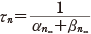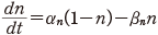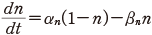 この αn と βn も実験から次のようにその値が得られる.静止電位の状態の n を n0 とすると,定常状態を考えて次の関係を得る.