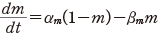 のぐらいの割合であるかを表す変数で0から1の間の値をとること,それが αn と βn の時間変化率でその開閉の割合を変えること,である.また n4 の4乗は,そのようなゲートが4つあって全体として積の形で効くような機構をもつことを示唆する.