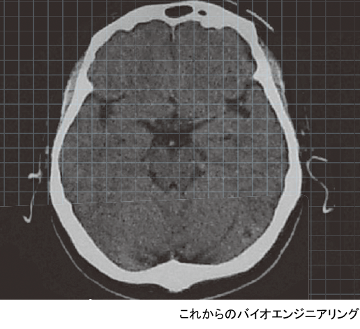 一方,右は脳内の構造をMRI(magnetic resonance imaging:核磁気共鳴イメージング)によって得た画像である.眼球より少し上の水平面で見たものである.大きな面積を占める灰色の部分が脳であり,白い頭蓋の中に納まっている.中心付近には視床などの間脳や脳室があり,生命活動の基本を支えている.その外側の頭蓋に近いところは大脳皮質と呼ばれ,ヒトの高度な情報処理機能はここを中心に行われている.大脳皮質は2次元的な広がりを持ち,それが折りたたまれるようにして頭蓋内に納められている.いわゆる,脳の
