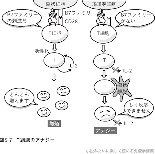 アナジーとは聞き慣れない言葉かと思いますが、それはT細胞が異物によって刺激されるしくみの研究から明らかになってきました。成熟した後ではじめて抗原とMHCの複合体をもった樹状細胞に出会ったT細胞が刺激されてはたらく(これを活性化といいます)ためには、T細胞受容体を介した刺激に加えてCD28から伝えられる第二の刺激が必要です。両方の刺激を受けとると、T細胞は自分が増えるために必要なインターロイキン(IL)-2というサイトカインをつくります。CD28に結合して刺激するタンパク質は複数あり、これらはB7ファミリーとよばれ、抗原提示細胞である樹状細胞、マクロファージ、活性化されたB細胞の三種類の細胞がもっています。T細胞がはじめて抗原(とMHCの複合体)に出会ったときに第二の刺激がないと、T細胞はIL-2をつくれないために増えることができなくなります。のみならず、その後にB7ファミリーをもった樹状細胞によって二つの刺激を受けても、もはや反応できなくなるのです。この状態をアナジーとよびます(図5-7)。二つの刺激が必要な理由は、T細胞がはじめて抗原に出会う際に、樹状細胞などの抗原提示細胞によってのみ活性化されることを保証するためと考えられます。胸腺ではつくられない自分の抗原に反応するT細胞が胸腺から出てきたとしても、その抗原が樹状細胞によってMHCと一緒にみせられて、かつB7ファミリーがCD28を刺激しない限り活性化しないための安全弁ともいえます。例えば、胸腺にはない自分の抗原が血管でつくられていてT細胞が胸腺から出てきてはじめて血管でその抗原(とMHCの複合体)に出会っても、B7ファミリーがないので活性化されずアナジーに陥ることになります。抗原提示細胞以外の細胞は第二の刺激に必要なB7ファミリーをもっていないので、自分に反応する可能性のあるT細胞の多くがアナジーに陥ると考えられます。