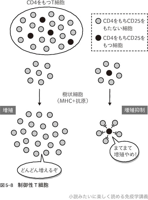 T細胞のなかには免疫反応を抑えるはたらきをもつものもいます。CD4をもつT細胞のなかに、CD25をもつT細胞が五%くらい存在します。CD25はIL-2の受容体を構成する分子であることから、はじめは刺激を受けて活性化されたT細胞かと思われましたが、CD25をもつT細胞はCD25をもたない他のT細胞の活性化を強力に抑えるはたらきをもつことがわかりました(図5-8)。この細胞は制御性T細胞とよばれ、その特徴はFoxp3というタンパク質をつくることです。Foxp3は先天性の自己免疫疾患の一つであるIPEXで変異をもつ遺伝子として見つかりました。IPEXでは全身でさまざまな組織が攻撃されます。この病気はいろいろなことを私たちに教えてくれました。Foxp3に異常があっても胸腺ではAireやFezf2のはたらきで自分の反応するT細胞はとり除かれていて、このはたらきは正常です。したがって、胸腺の外に出てくるT細胞は、自分のMHCと異物由来のタンパク質が分解されてできたペプチドとの複合体によって活性化されるT細胞のはずです。しかし、全身でさまざまな組織が攻撃されるということは、自分のMHCと自分のタンパク質が分解されてできたペプチドとの複合体によって活性化されるT細胞がいるということです。制御性T細胞はこのようなT細胞の活性化を抑えていると考えられています。Foxp3に異常があって制御性T細胞がつくられないと、少しの刺激でもT細胞が活性化され、ブレーキがかからなくなるのです。