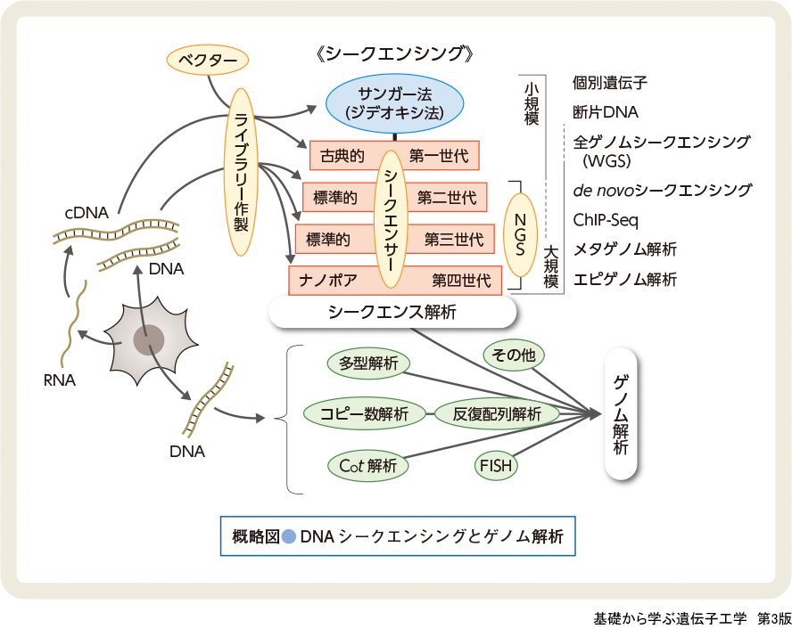 重合分子を構成するモノマーの配列(sequence)の順番を解析することをシークエンシング(シークエンス解析)という.DNAの塩基配列解析は遺伝子工学のコアをなす技術の1つで,制限酵素切断解析やハイブリダイゼーション解析といった大まかな核酸解析技術を過去のものにするほどの威力をもっている.今や日常的作業になりつつあるDNAシークエンシングについて,その技術的な面に加え,変遷・応用・可能性などについてもみていこう.