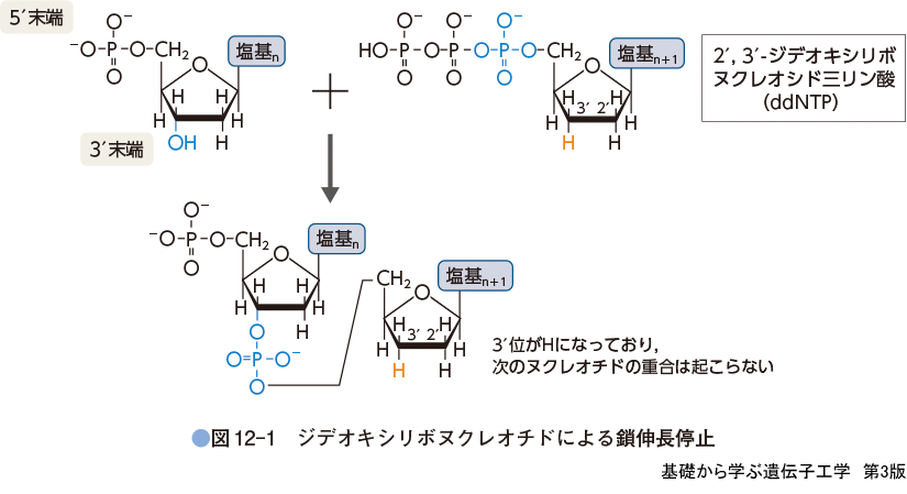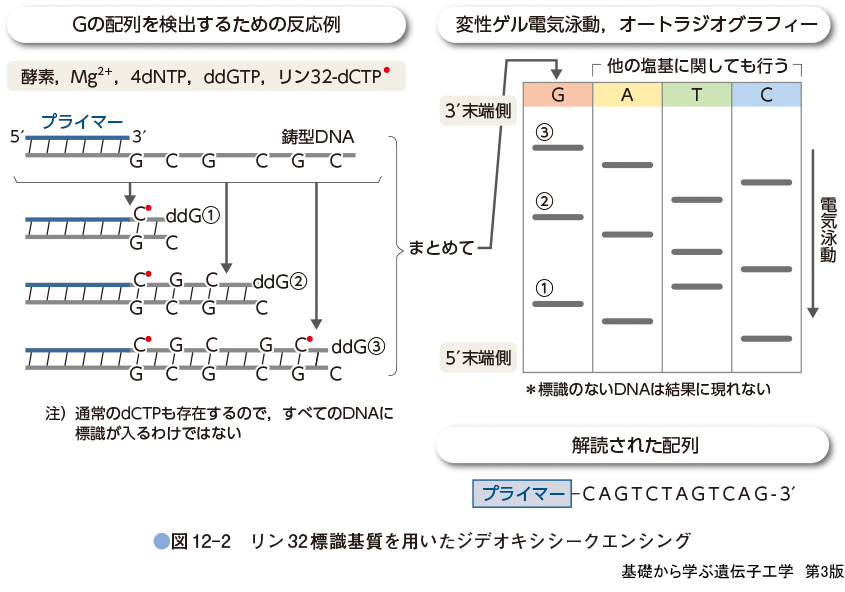DNA合成反応で,基質としてdNTPではなく,2′,3′ - ジデオキシリボヌクレオシド三リン酸(ddNTP)を使うと,それらはDNAに取り込まれるも,3′末端に-OHがないのでその後の鎖伸長が起きない(図12-1).この鎖停止反応をそれぞれの塩基について行い,RI標識産物を変性ゲル電気泳動とオートラジオグラフィーで解析すれば,バンド(反応の止まった生成物)の位置から塩基の種類が判断できる.実際にはdNTPとddNTPの両方を加えるために,特定塩基において種々の場所で伸長停止した産物ができ,それらがオートラジオグラフィー上ではしご状のバンドとして現れる(図12-2).実施され始めた頃は,一本鎖の鋳型DNAを調製しなくてはならなかった(図12-3).
