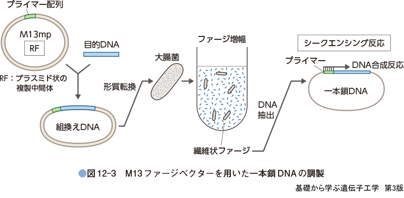 DNA合成の鋳型として,最初期には一本鎖DNAを用いていたが(図12-3),これを取得するためには,M13ファージ由来のM13mp系ベクターや,一本鎖ファージを産生できるプラスミド(ファージミド)にいったんサブクローニングする必要がある(⇒7章-7).