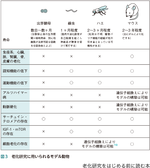ヒトやマウスといった哺乳類はもちろんのこと,ハエや,もっと単純な生物である線虫にまで老化は存在しています(図3).また動物のような多細胞生物でないのでイメージが湧きにくいかと思いますが,単細胞生物である酵母についても,研究者らにより “酵母の老化” なる現象が定義されています.ここにあげた生物種はいずれも老化研究のモデル動物として用いられることがあります.ヒトの老化と酵母の老化はきわめて異なっていますが,例えば代謝を調節することで老化の速度に一定の影響を及ぼすサーチュインというタンパク質はヒトと酵母の両方に存在しています.当該研究領域の発端は酵母研究によりもたらされました16).基本的にヒトからかけ離れた動物であればあるほど,その生物の老化研究から見出された発見がヒトに当てはまる可能性は低くなります.それでも,酵母やハエだから可能な研究があり,そこから多くの重要な知見がもたらされているのです.