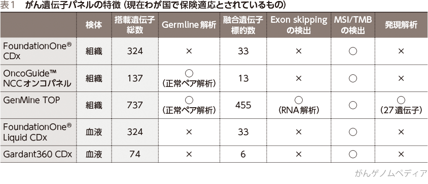 現在わが国で承認されているパネル検査には組織用(FoundationOne® CDxやOncoGuide™ NCCオンコパネル,GenMine TOP)と血液用(FoundationOne® Liquid CDx,Gardant360 CDx)があり,そのうちどれを使用するのかについて症例ごとに検討していく必要がある(表1にそれぞれのパネルの特徴をまとめた).OncoGuide NCCオンコパネルならびにGenMine TOPは同一患者の正常DNAも解析するので,体細胞変異(⇒ 基礎編1章Keyword 1)と生殖細胞多型(⇒ 基礎編1章Keyword 2)の鑑別が可能である.またGenMine TOPは一部の遺伝子についてRNAも解析するため,PD-L1を含めた発現情報(⇒ 基礎編3章Keyword 7)も検出することができる.