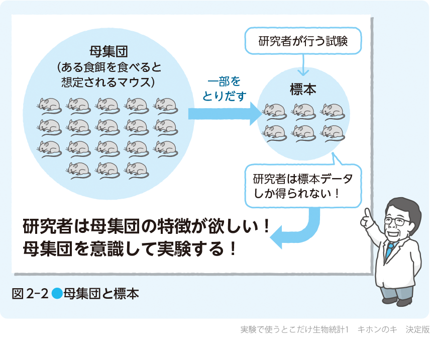 図2-2をみてほしい.この場合の母集団とは,世界中の同じ試験食を摂食する,あるいは,将来的に摂食すると想定されるマウス全部を意味する(そのような母集団が実際に存在するわけではない).研究者は世界中のマウス(母集団)を用いて実験することはできないので,しかたなく母集団から標本として6匹のマウスを抽出して実験している.すなわち,この実験は標本の実験である.しかし,本当は,母集団でも同様の結果が得られることを期待しているはずである.すなわち,多くの研究者は標本データしか得ることはできないが,標本データから母集団の特徴を推定することを目的として研究しているのである.母集団の特徴とはすなわち,真実である.研究者は真実を推定するために研究しているはずである.