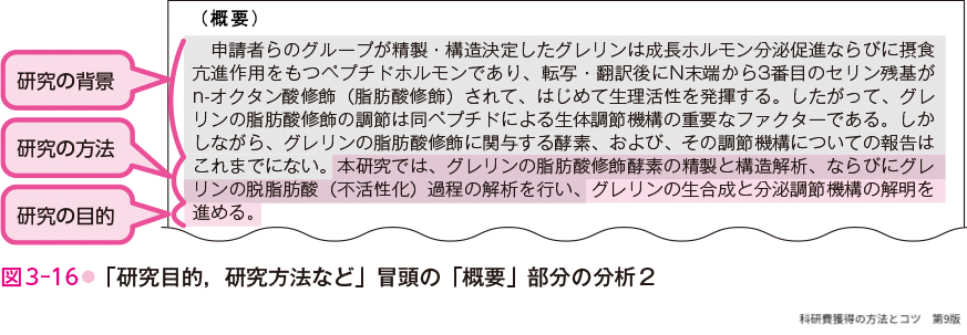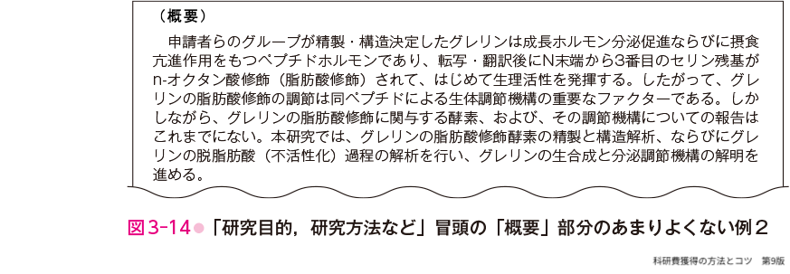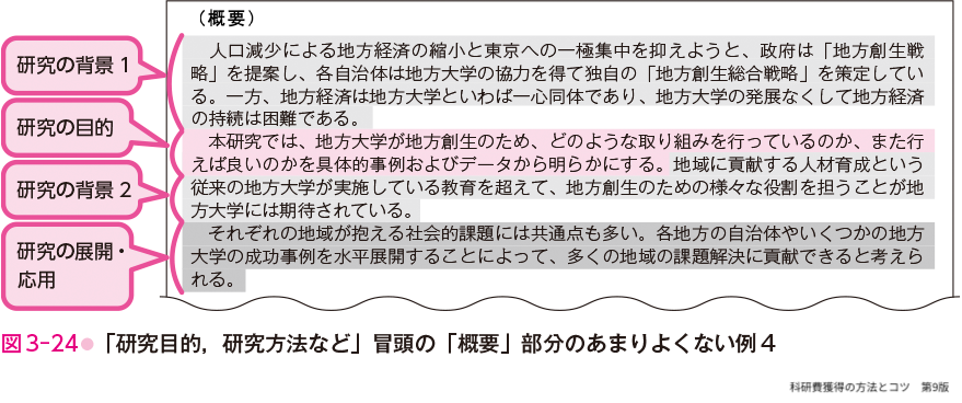 「概要」部分を読むときに,研究の①背景と問い,②目的,③展開・応用と3つの項目に注目してみると,自分の書いた概要の欠点がよくわかる.次の例,図3-14をみてみよう.